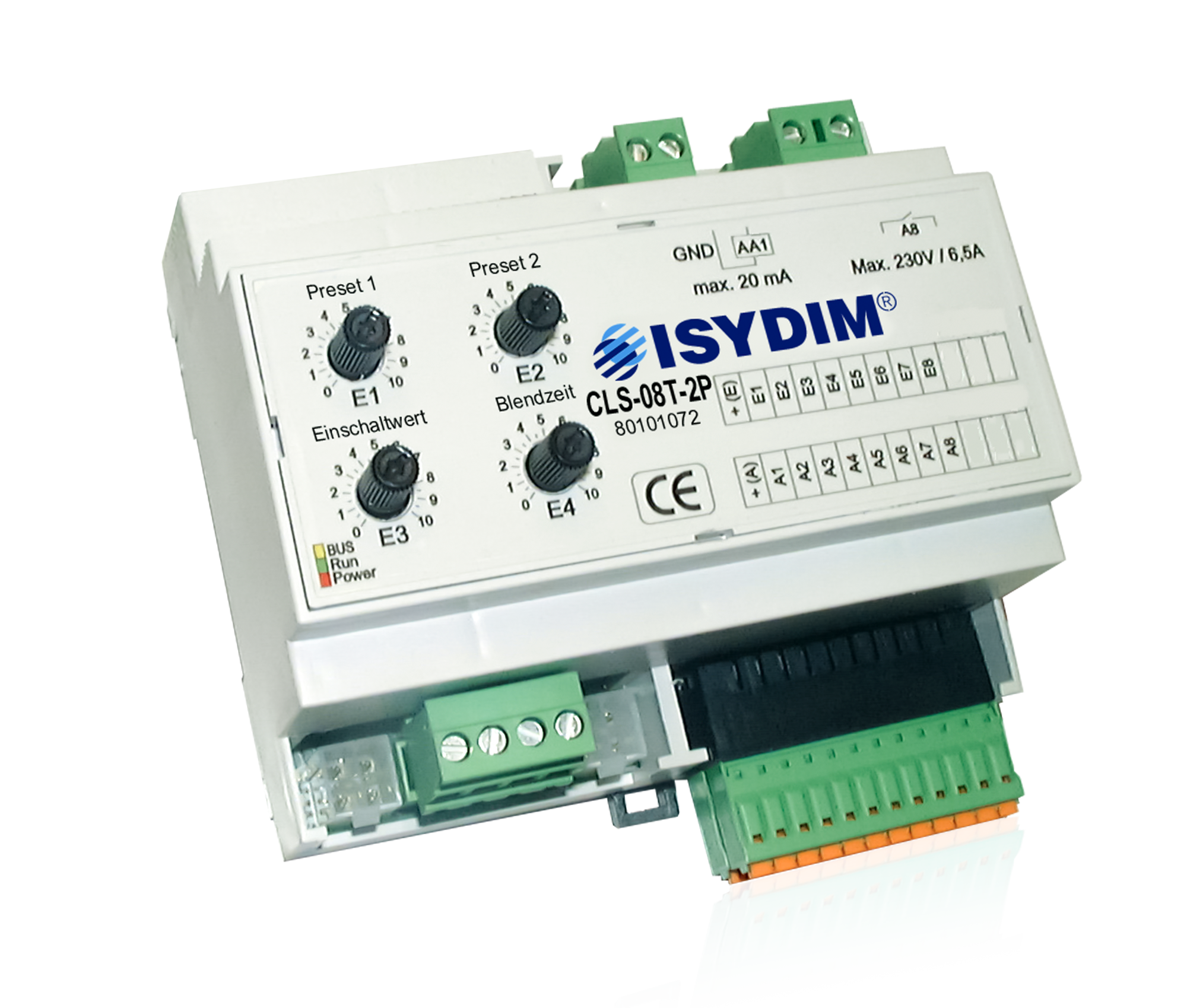 The CLS-08T-2P Light Control Unit is a convenient solution for lighting controls with standardised 0(1)-10V interface for source and sink operation. The interface can be loaded with 20mA and is used for direct connection of dimmable fluorescent lamps with ECG 1-10V or LV halogen lamps with 1-10V transformer. A hybrid relay switching output with a load capacity of 230V, 1500VA, 6.5A is also available for the analog output. This is optimised for ECG loads by a special zero-crossing circuit and guarantees a safe mains circuit for dimming. By using additional power dimmers, a wide variety of applications and power classes can be realised. The basis of the control unit is a digital, future-oriented multiprocessor technology, which guarantees easy to operate functions and extremely safe operation.