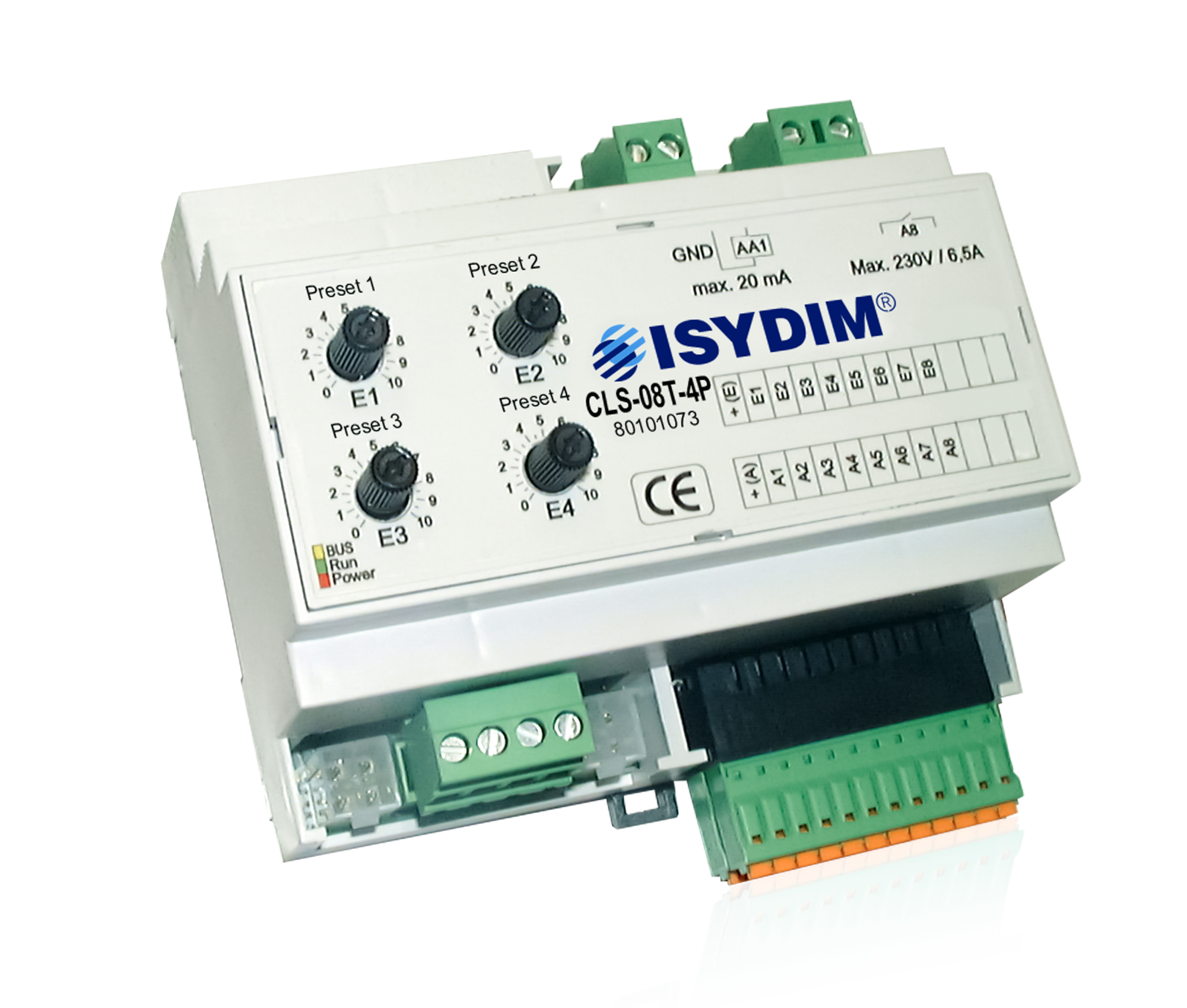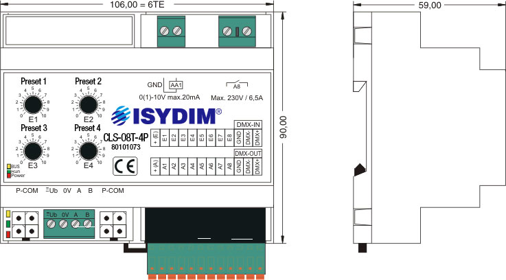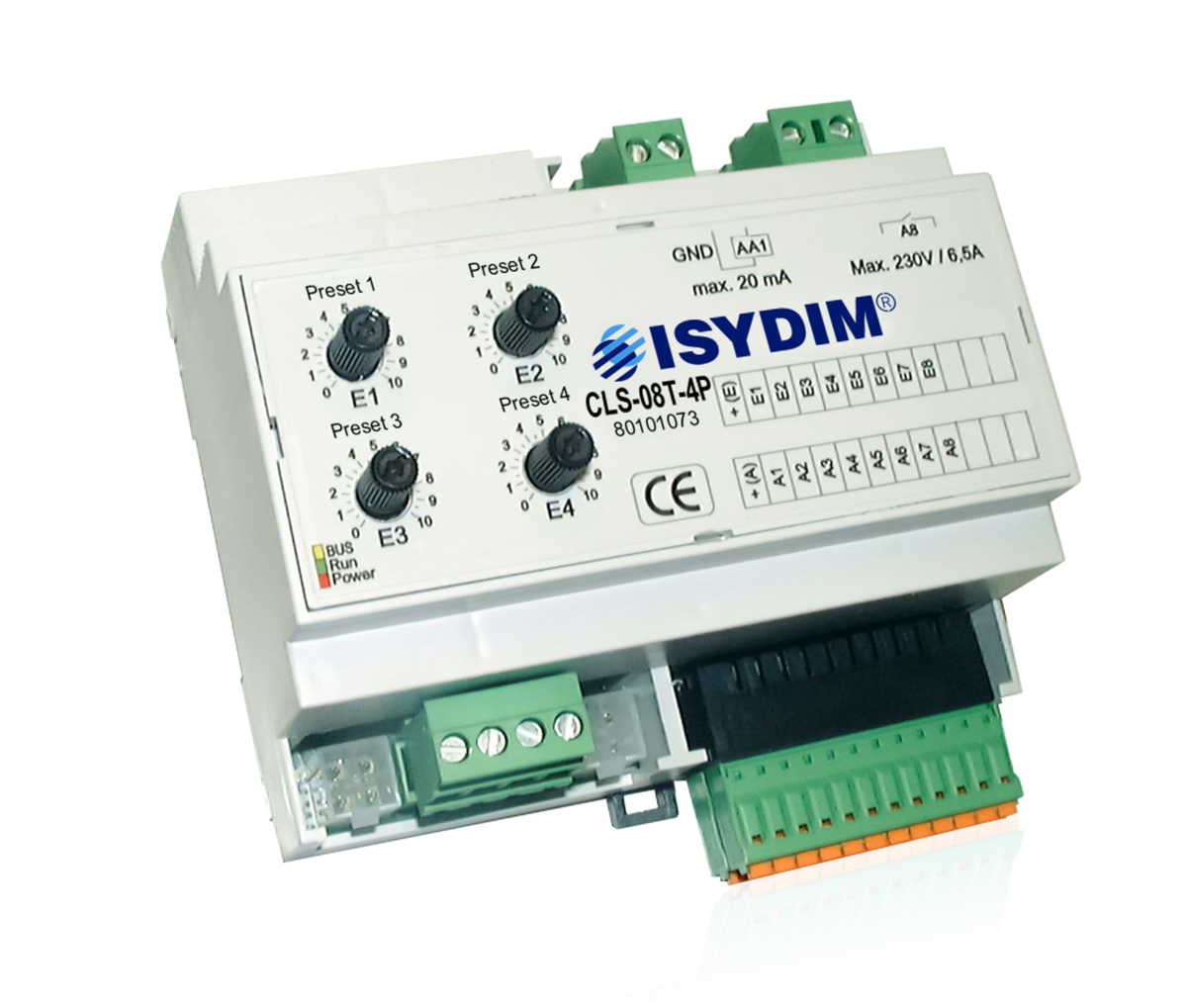 The CLS-08T-4P is a comfort solution for lighting controls with standardised 0(1)-10V interface for source and sink operation. The interface can be loaded with 20mA and is used for direct connection of dimmable fluorescent lamps with ECG 1-10V or LV halogen lamps with 1-10V transformer. A hybrid relay switching output with a load capacity of 230V, 1500VA, 6.5A is also available for the analog output. This is optimised for ECG loads by a special zero-crossing circuit and guarantees a safe mains circuit for dimming. By using additional power dimmers, a wide variety of applications and power classes can be realised. The basis of the control unit is a digital, future-oriented multiprocessor technology, which guarantees easy to operate functions and extremely safe operation.