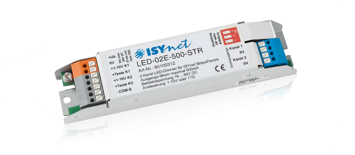 The 2-channel LED Dimmer was developed for powerless dimmable LEDs and LED lamps. Here 2 PM outputs with a respective load capacity of up to 500mA are available. The control functions focus on stand-alone applications. 6 different operating modes can be set.