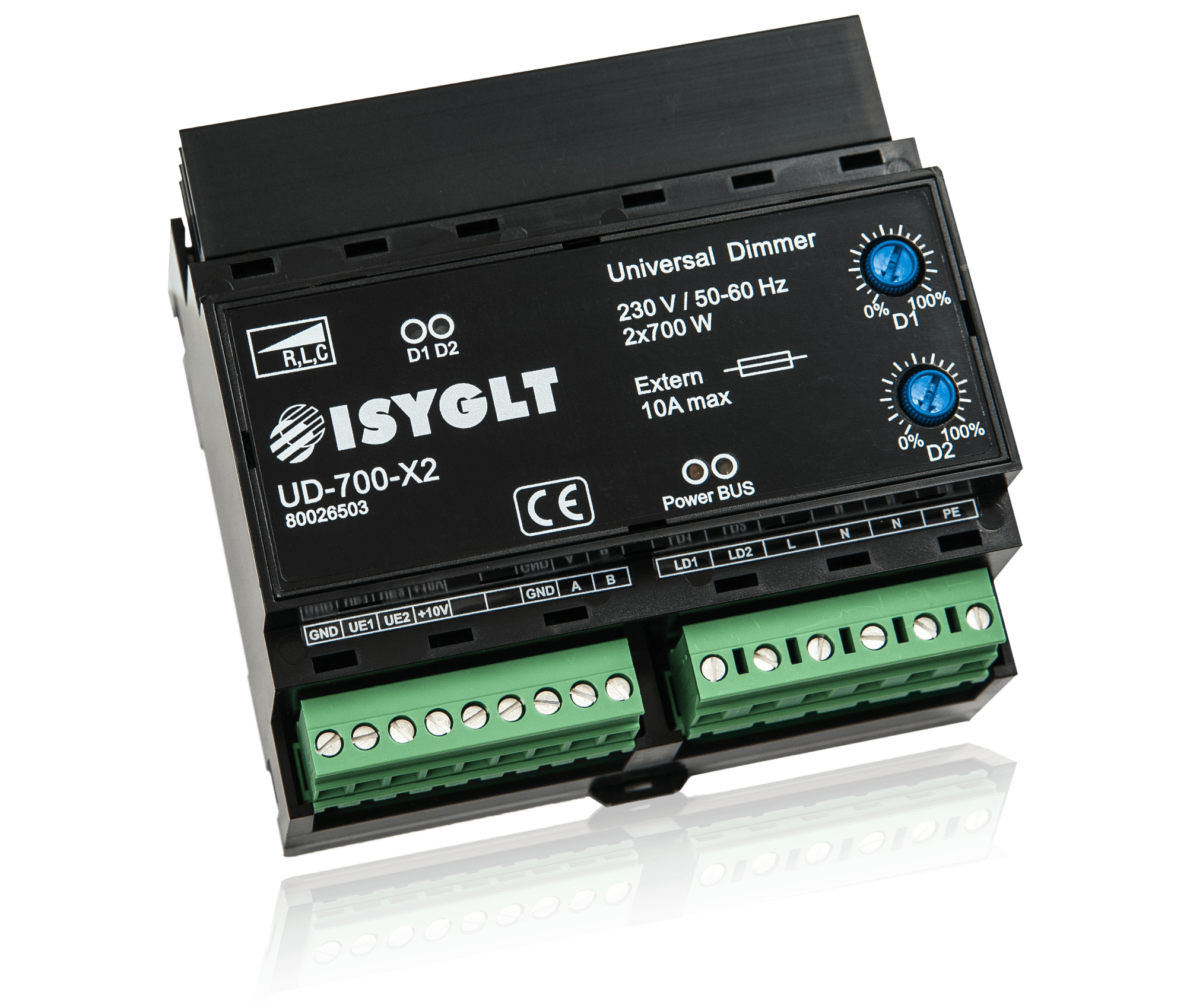 | Single-button dimmer | Control via standard buttons on terminals UE1 and UE2 against GND Press briefly = on/off, press longer = dim |