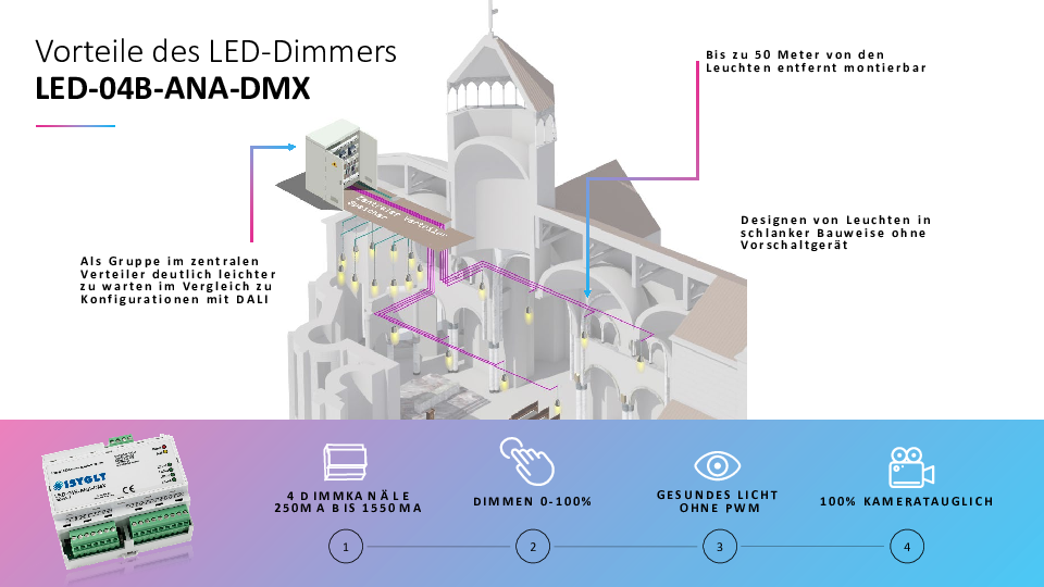Our LED-04B-ANA-DMX is 100 % camera-compatible, which plays a major role in wedding ceremonies and christenings.