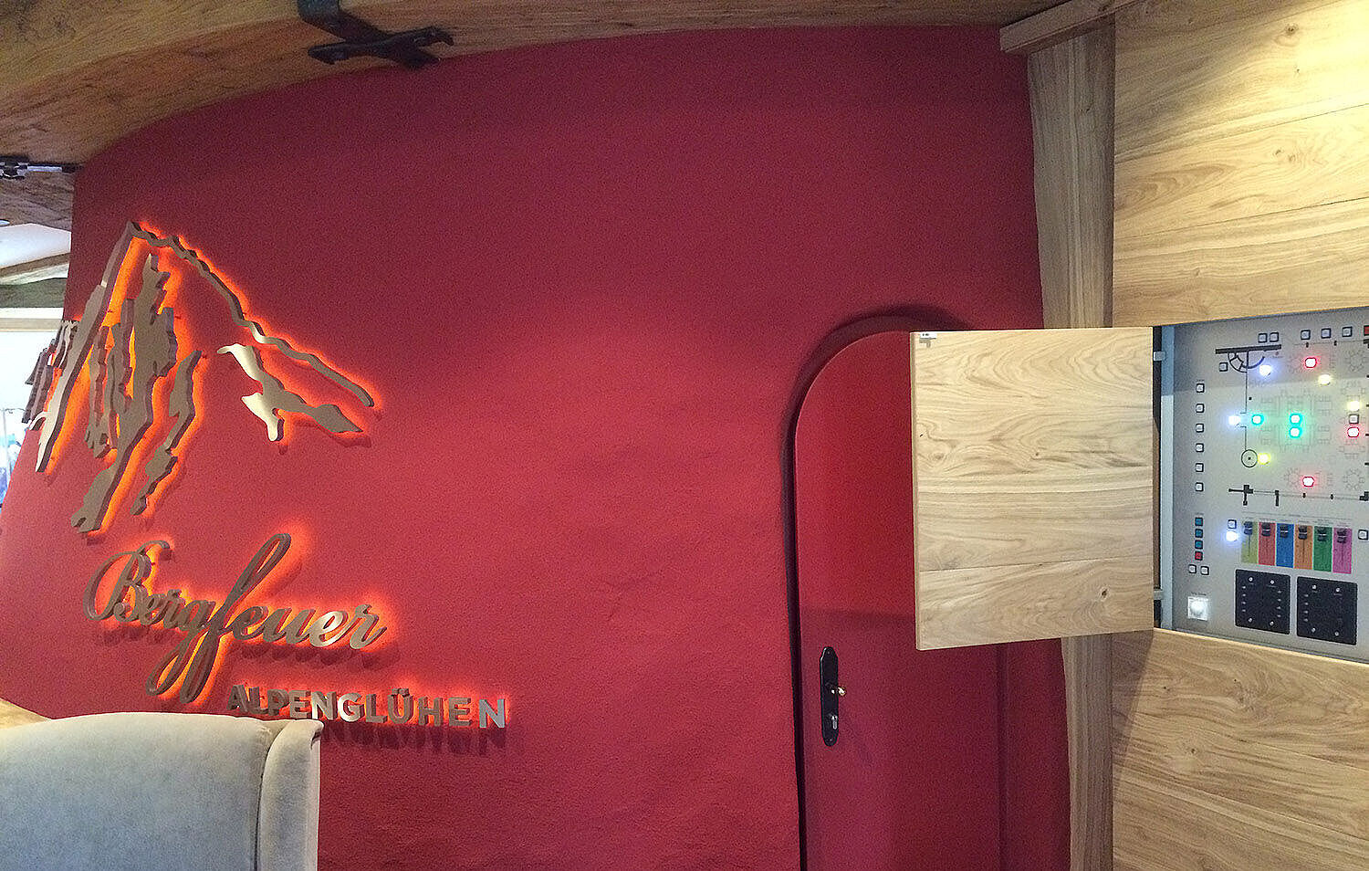 First ISYGLT control at the Sonnenalp:- Scene control of two areas with one coloured panel each (panel 550x640mm, colour anodised, backed ground plan, push-button + slide control)