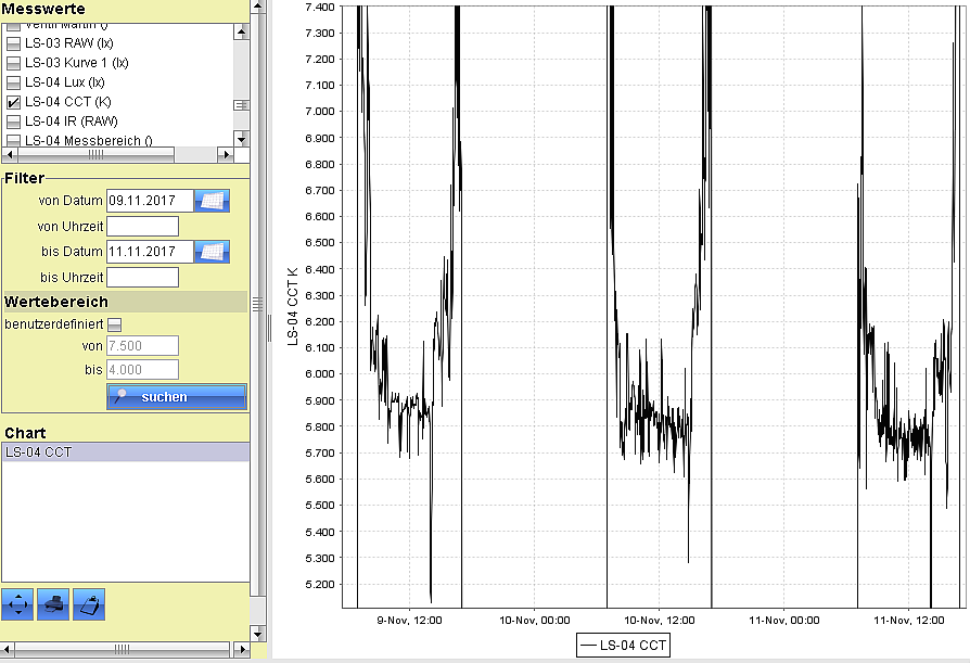 Messwerte der Farbtemperatur des Farblichtsensors LS-04 in der IPMS-Aufzeichnung. Die Position des Sensors liegt im Außenbereich in Bad Tölz.