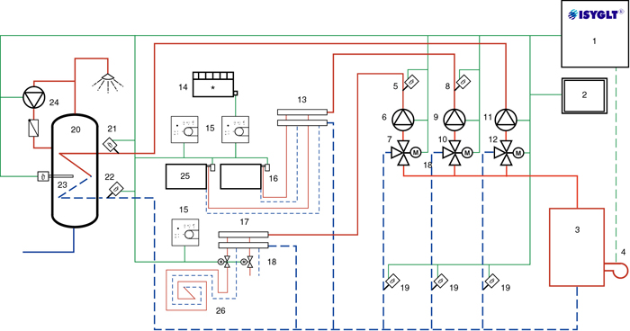 Das BUS-System für Gebäudeautomation ISYGLT bietet neben allen anderen wichtigen Funktionsgruppen im Gebäude auch eine umfangreiche Heizungsregelung an. Das unten stehende Schema für die Heizungsregelung umfasst Fußbodenheizung (26), Radiatorheizung (25) und Warmwasserbereitstellung (20). Bei Bedarf ist eine direkte Schnittstelle zum Brenner (4) möglich. Die Radiatorheizung und die Fußbodenheizung wird über Heizkreisverteiler (13 und 17) gespeist. Die Regelung (1) erfasst die einzelnen Temperaturwerte und steuert die Pumpen (6, 9, 11, 24), Mischventile (7, 10, 12) und Einweg-Stellventile (16, 18). Die Ansteuerung der Einweg-Stellventile kann analog (0-10V) oder digital (quasi stetig) erfolgen. Durch den ständigen Vergleich der Vorlauf- (5, 8, 21) und der Rücklauftemperaturen (19, 22) werden die Umwälzpumpen (6, 9) bzw. die Warmwasserspeicher-Ladepumpe (11) und die Dreiwege-Mischventile (7, 10, 12) nachgeregelt, so dass energiesparend die optimale Wärmeenergie zur Verfügung gestellt wird.