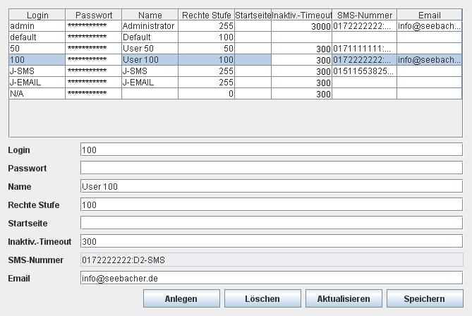 Damit Funktionen der Visualisierung nur bestimmten Personen vorbehalten bleiben, kann bei Bedarf eine interne Benutzerverwaltung verwendet werden. Neben Benutzername und Passwort lassen sich die Rechtestufe (0-255), eine individuelle Startseite, eine Inaktiv-Zeit für einen automatischen Logout, sowie Handynummer und E-Mail-Adresse angeben.