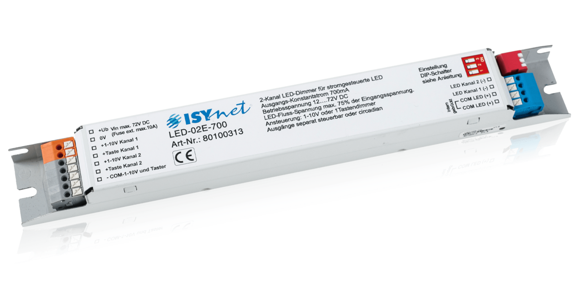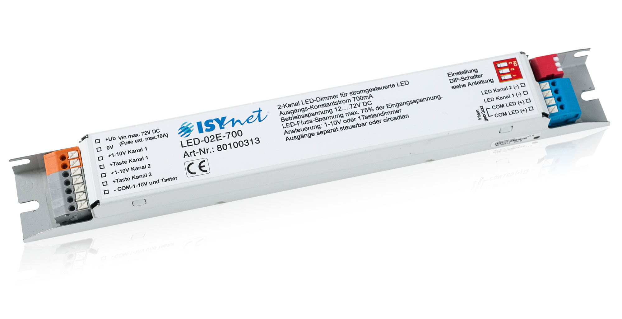 Der 2-Kanal-LED-Dimmer wurde für Power-LEDs und LED-Leuchten entwickelt, die mit 700mA Konstantstrom betrieben werden. Seitens der Steuerfunktionen stehen Stand-Alone-Anwendungen im Vordergrund. Es sind 6 verschiedene Betriebs- bzw. Bedienarten einstellbar.