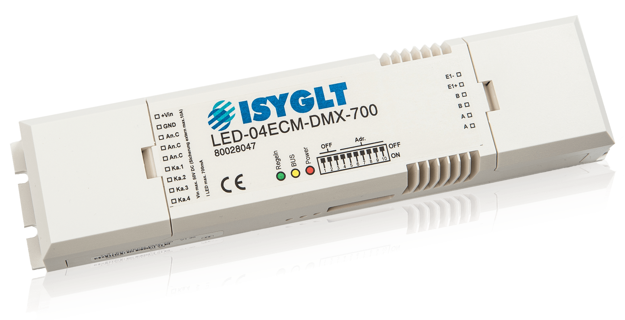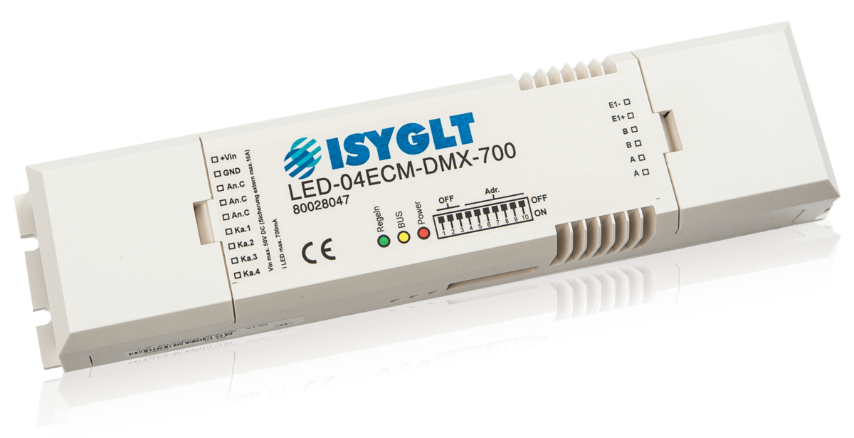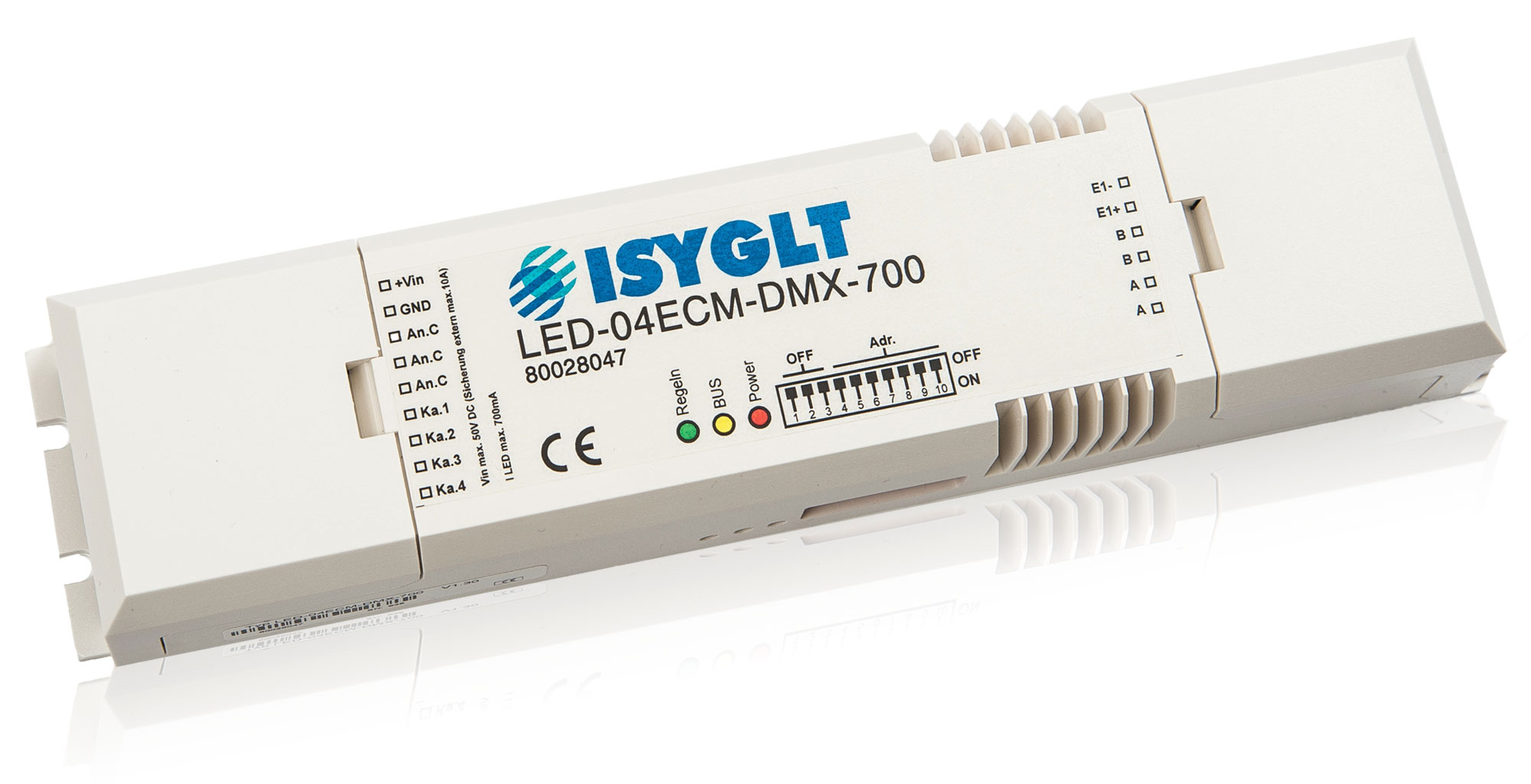 Der LED-04ECM-DMX-700 kann wahlweise am ISYGLT-BUS oder DMX512-BUS betrieben werden.