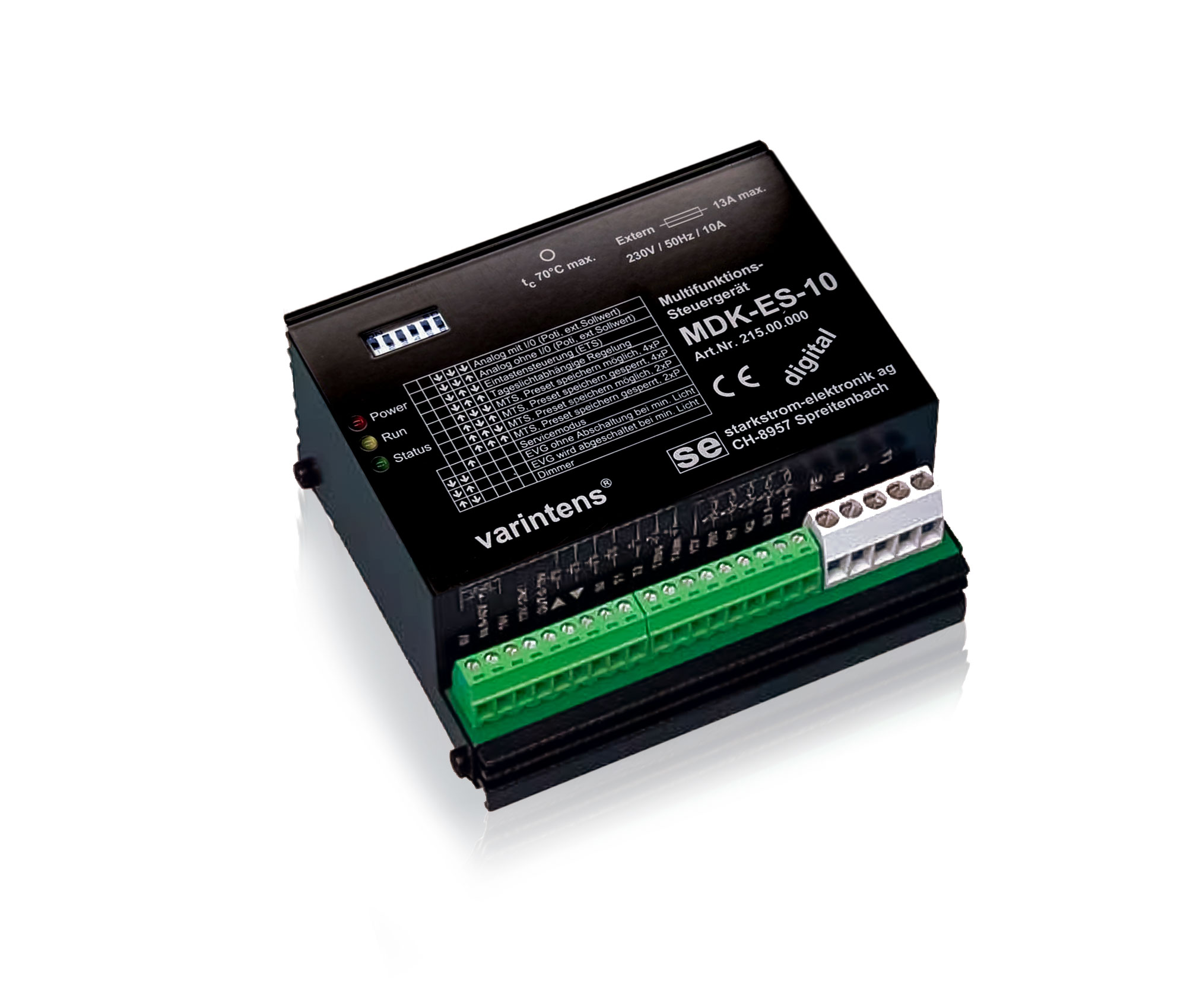 Das varintens MDK-ES-10 ist ein digitales Multifunktions-Steuergerät, das einerseits durch verschiedene Arten angesteuert und andererseits zum Ansteuern unterschiedlicher Lasten verwendet werden kann.