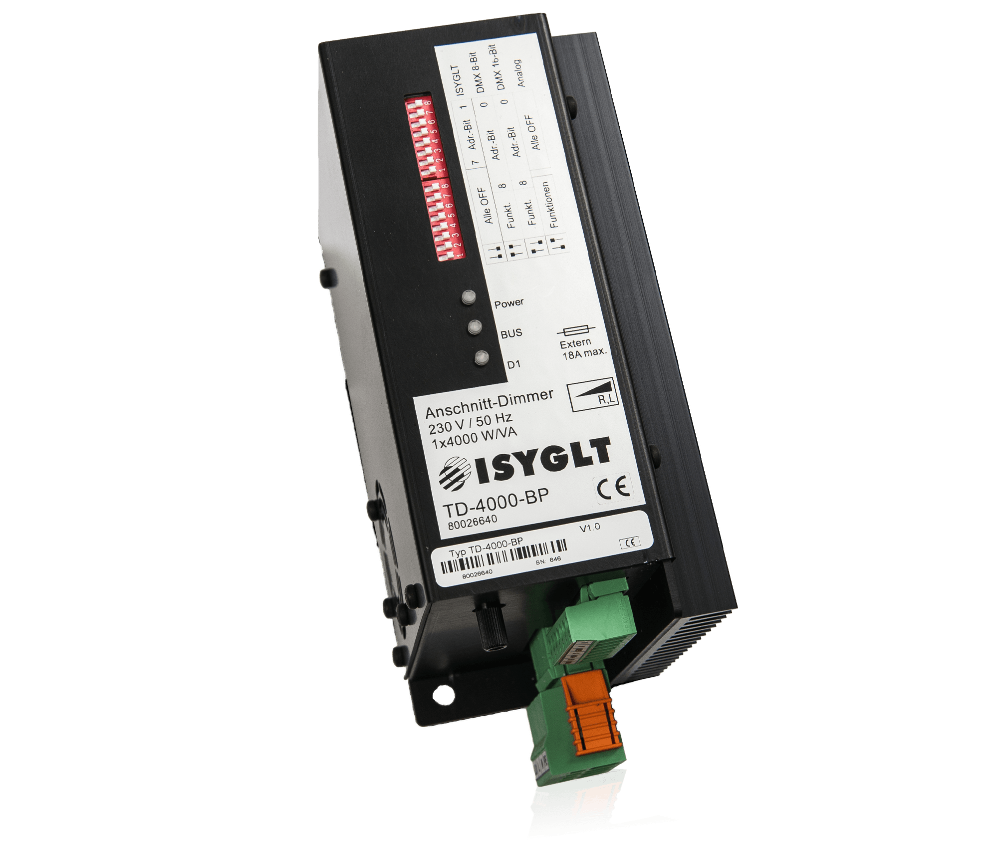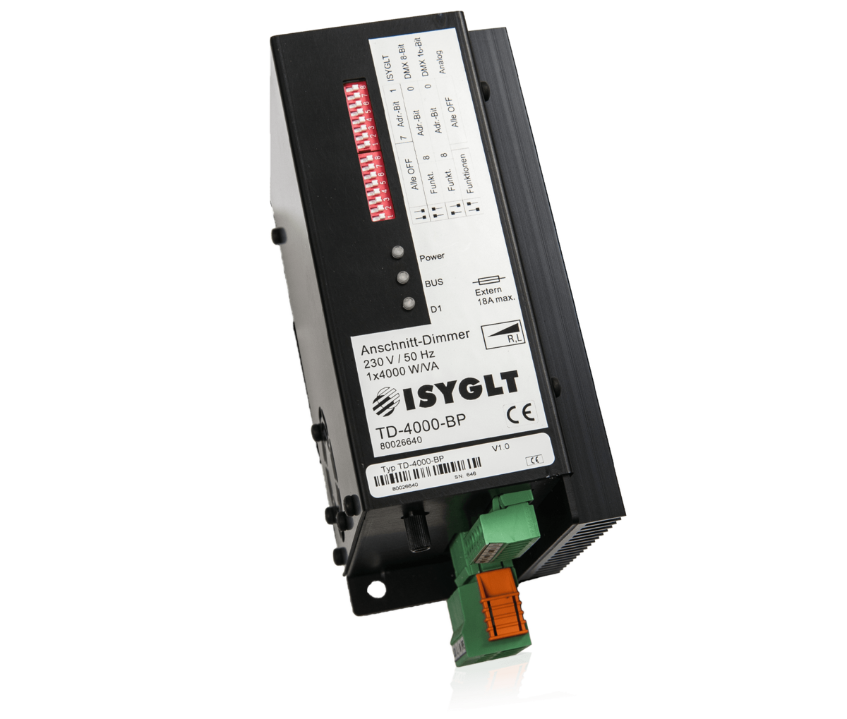 Der TD-Dimmer ist ein klassischer Phasenanschnittdimmer in 16-Bit "Thyristor Antiparallel Technologie". Diese Steuerungsart ist mit Sicherheit die Oberklasse der Dimmer und nicht mit den einfacheren Triac-Dimmern zu vergleichen. Hier erfolgt die Ansteuerung und Überwachung für jede Halbwelle getrennt, da entsprechend jeweils ein Thyristor vorhanden und zuständig ist. Der Dimmer zeichnet sich durch seine extreme Robustheit in der jeweiligen Leistungsklasse aus. In der Phasenanschnittsteuerungstechnik können alle ohmschen Lasten (Glühlampen, Hochvolthalogen, Heizungen) und induktiven Verbraucher (Halogen mit magnetischen Trafos, Leuchtstofflampen mit VIP-90, Motore, Kunststoffschweißgeräte mit magnetischen Trafo) betrieben werden. Der Dimmer verfügt über mehrere Ansteuerungsarten und kann konventionell mit internem oder externem Poti, Taste, 0-10V, 1-10V oder 0-55µA-Signal oder digital im ISYGLT-BUS, DMX512 8-Bit oder DMX512 16-Bit betrieben werden. Die Grundfunktionsparametrierung erfolgt über 2 DIP-Schalter, Detailparameter sind nur im ISYGLT-System einstellbar.