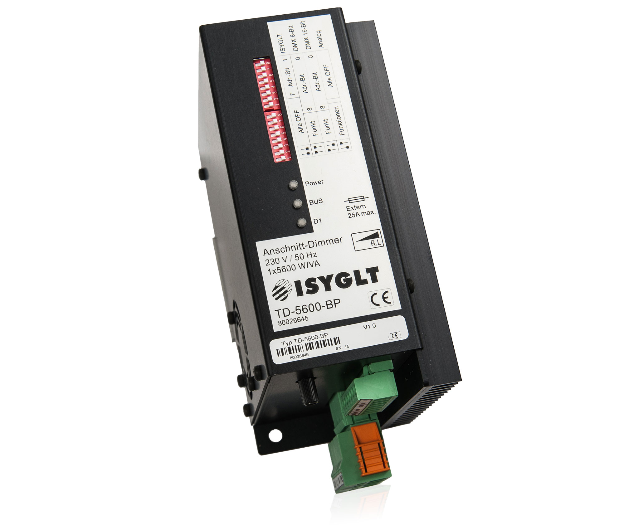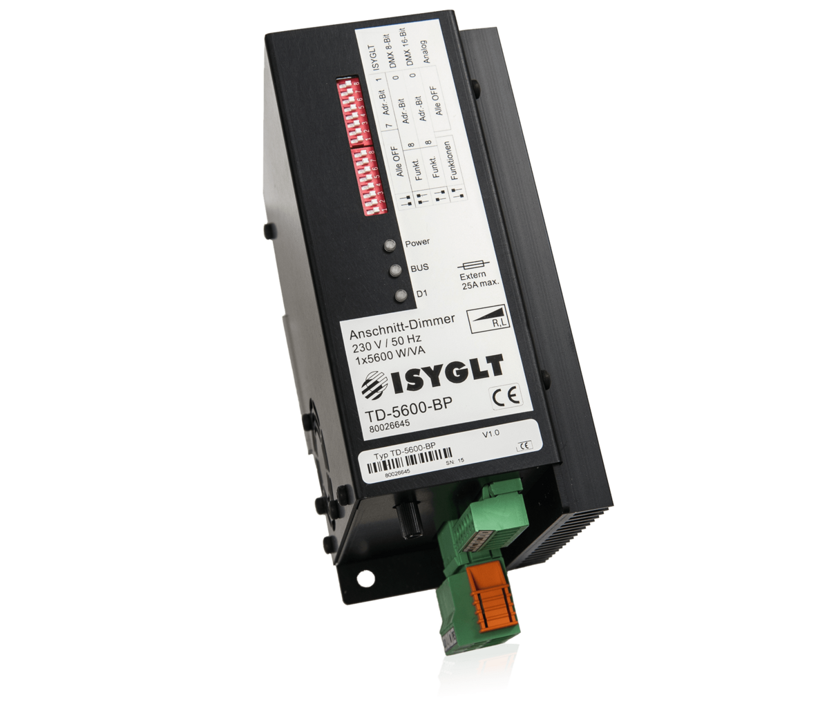 Der TD-Dimmer ist ein klassischer Phasenanschnittdimmer in 16-Bit "Thyristor Antiparallel Technologie". Diese Steuerungsart ist mit Sicherheit die Oberklasse der Dimmer und nicht mit den einfacheren Triac-Dimmern zu vergleichen. Hier erfolgt die Ansteuerung und Überwachung für jede Halbwelle getrennt, da entsprechend jeweils ein Thyristor vorhanden und zuständig ist. Der Dimmer zeichnet sich durch seine extreme Robustheit in der jeweiligen Leistungsklasse aus. In der Phasenanschnittsteuerungstechnik können alle ohmschen Lasten (Glühlampen, Hochvolthalogen, Heizungen) und induktiven Verbraucher (Halogen mit magnetischen Trafos, Leuchtstofflampen mit VIP-90, Motore, Kunststoffschweißgeräte mit magnetischen Trafo) betrieben werden. Der Dimmer verfügt über mehrere Ansteuerungsarten und kann konventionell mit internem oder externem Poti, Taste, 0-10V, 1-10V oder 0-55µA-Signal oder digital im ISYGLT-BUS, DMX512 8-Bit oder DMX512 16-Bit betrieben werden. Die Grundfunktionsparametrierung erfolgt über 2 DIP-Schalter, Detailparameter sind nur im ISYGLT-System einstellbar.