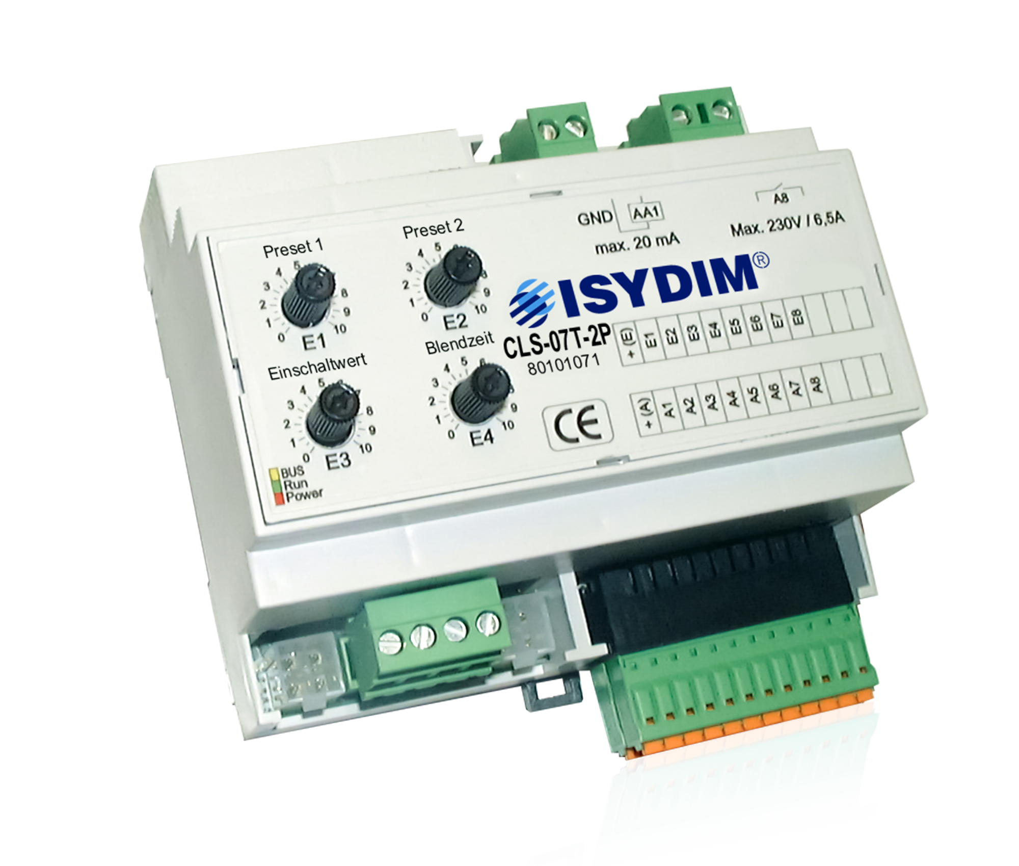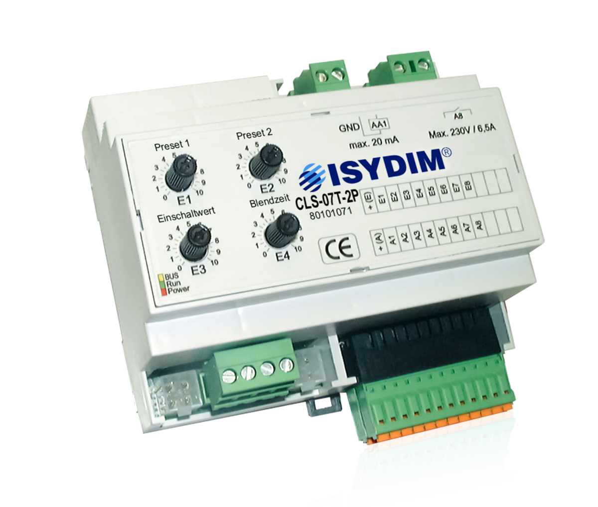 Der CLS-07T-2P ist eine Komfortlösung für Beleuchtungssteuerungen mit genormter 0(1)-10V-Schnittstelle für Source- und Sinkbetrieb. Die Schnittstelle ist mit 20mA belastbar und dient zum direkten Anschluss von dimmbaren Leuchtstofflampen mit EVG 1-10V oder NV-Halogenlampen mit 1-10V Trafo. Zum Analog-Ausgang ist auch ein Hybrid-Relais-Schaltausgang mit einer Belastbarkeit von 230V, 1500VA, 6,5A vorhanden. Dieser ist durch eine spezielle Schaltung im Nulldurchgang für EVG-Lasten optimiert und garantiert eine sichere Netzschaltung zur Dimmung. Durch die Verwendung von zusätzlichen Leistungsdimmern sind die unterschiedlichsten Anwendungen und Leistungsklassen realisierbar. Basis des Steuergerätes ist eine digitale, zukunftsweisende Multiprozessortechnologie, die einfach zu bedienende Funktionen und einen äußerst sicheren Betrieb garantiert.