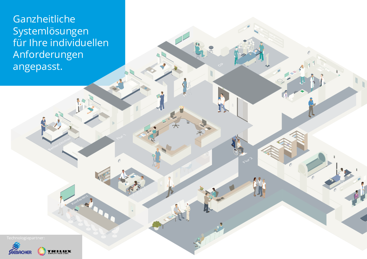 Ganzheitliche Systemlösungen auf Ihre individuellen Anforderungen zugeschnitten: hier Einbindung Touch-Panel oder Tableau z.B. Firma Bender. Beispiel für Schaltschemen der Flure, Bettenzimmer, OP-Saal oder Konferenzraum